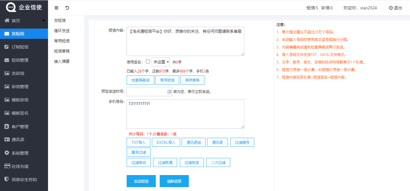 3,點擊發送短信,輸入發送文案和發送手機號,點擊發送短信即可,(短信發送后聯系客服人工審核下發)