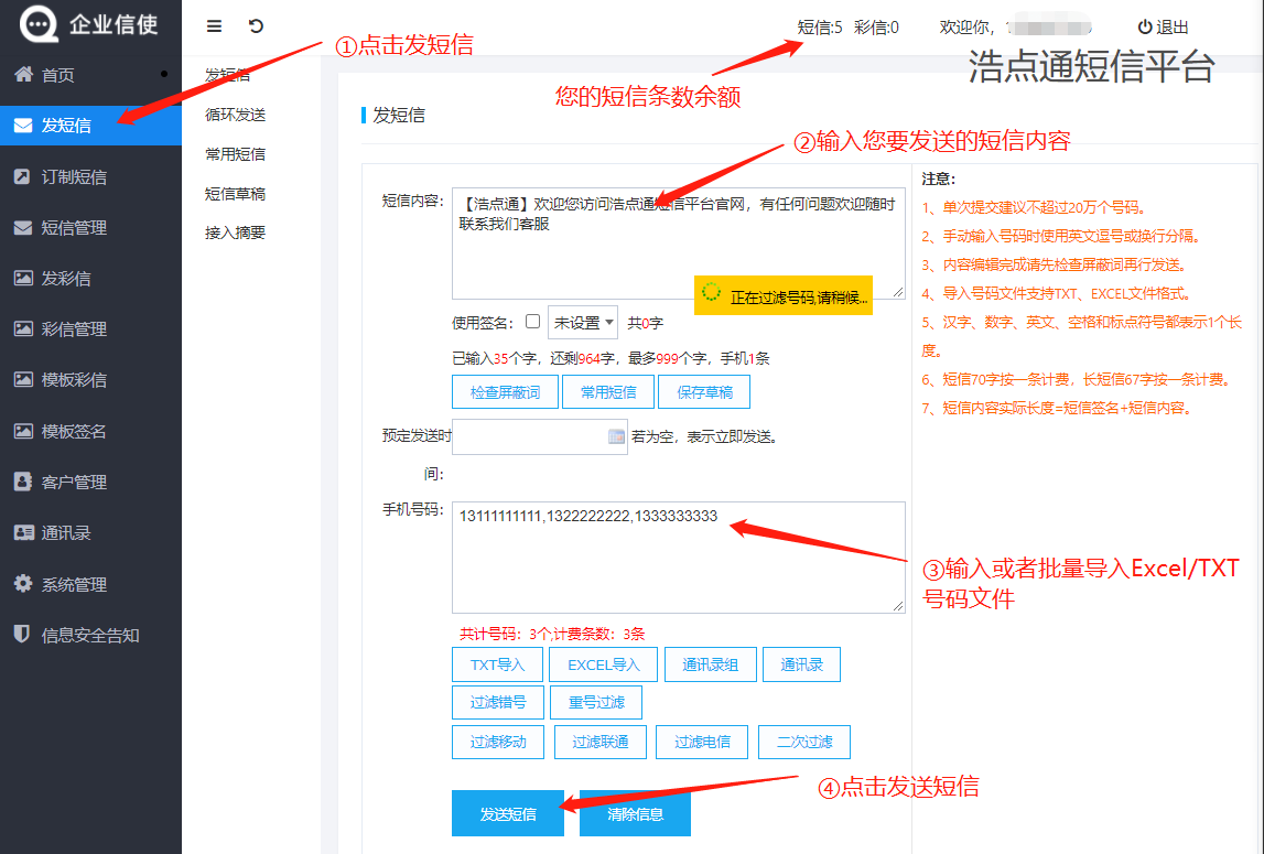 4,點擊發短信-輸入您需要發送的文案-輸入或者批量導入你需要發送的號碼-點擊發送短信即可